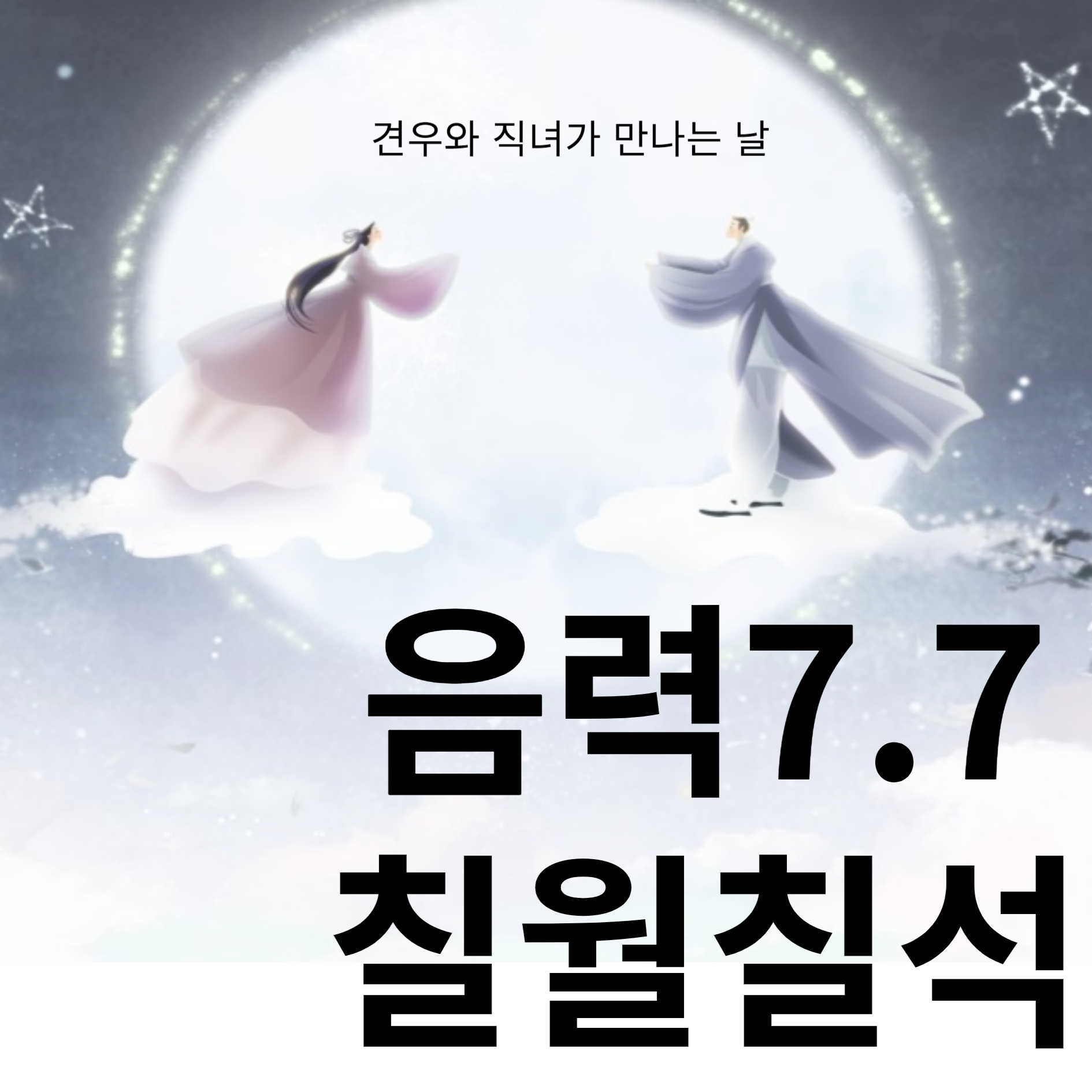 칠석이란 매년 음력 7월 7일을 가리키는 날로, 은하수 동쪽에 있는 견우와 서쪽에 있는 직녀가 까마귀와 까치가 놓은 오작교에서 1년에 한 번 만나는 날로 전해 진다.